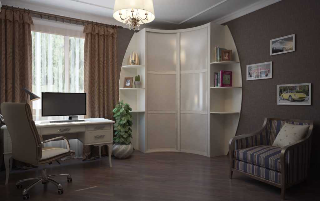 Оригинально выглядят в интерьере радиусные шкафы, которые не выглядят громоздкими благодаря изогнутым линиям. Но при этом они требуют не очень мало места для установки, и нередко в маленькой спальне выглядят нелепо.