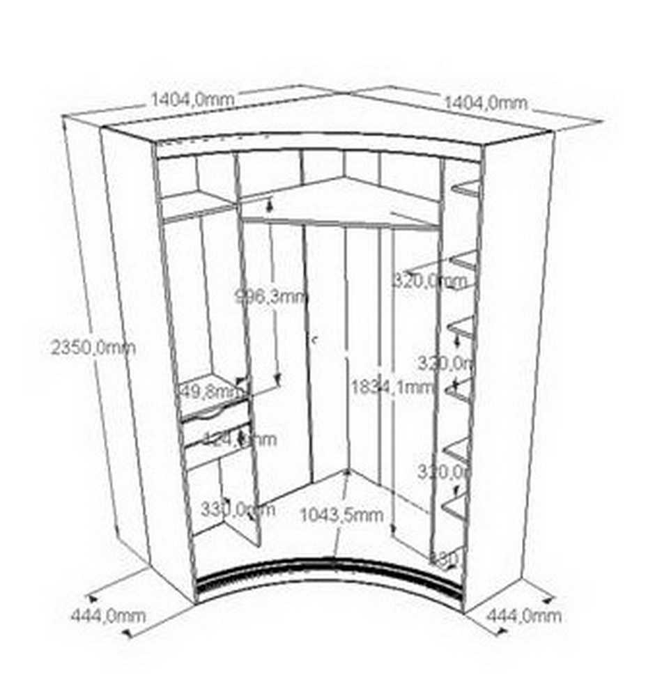- Если шкаф диагональный треугольного сечения, то минимальная длина сторон у прямого угла 120 см. Меньше будет очень маленький объем, хотя делают и со стенками длиной 100 см или даже меньше.