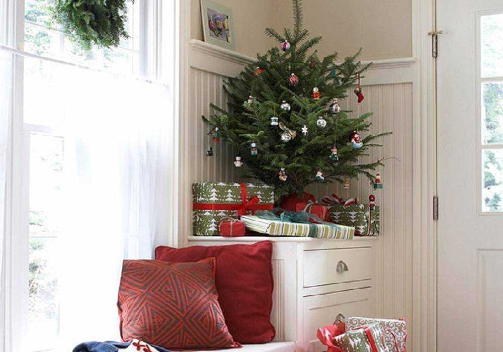- поставьте маленькую елочку на возвышении или смастерите настенное новогоднее деревце из мишуры, хвойных веток, гирлянд, которое не займет место в тесной комнате;