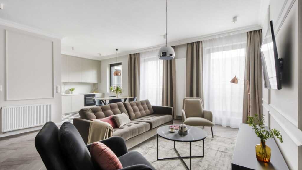 Цвет слоновой кости и кофейный цвет в интерьере гостиной