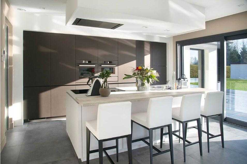 Главная черта встроенной кухни – компактность – позволяет поместить большой многофункциональный стол в центре интерьера