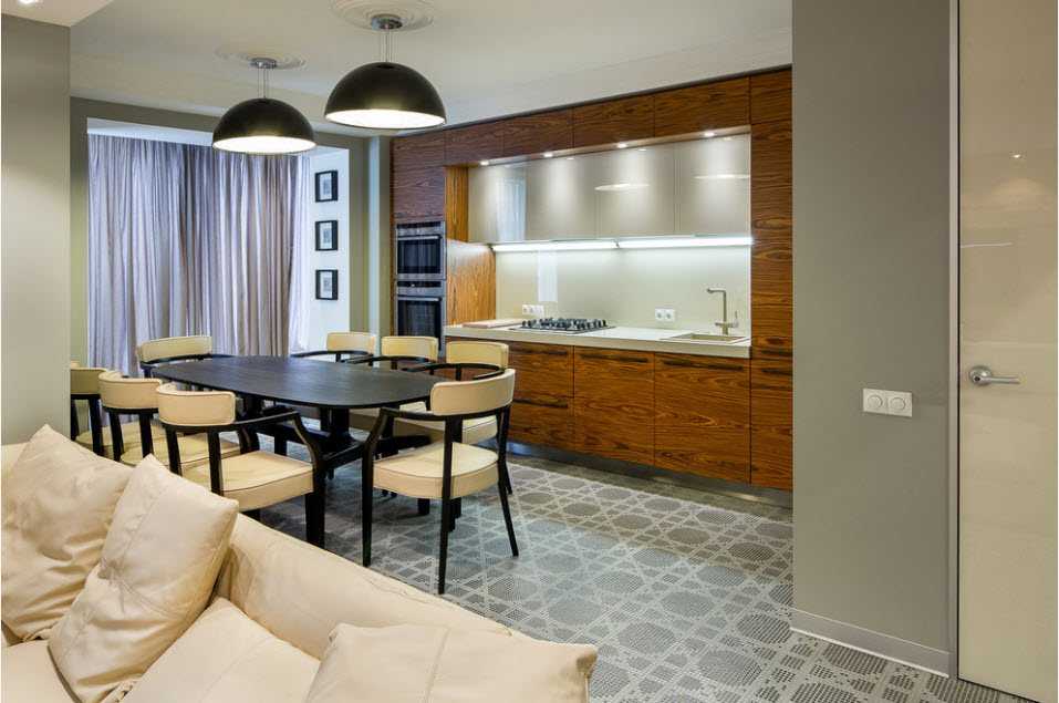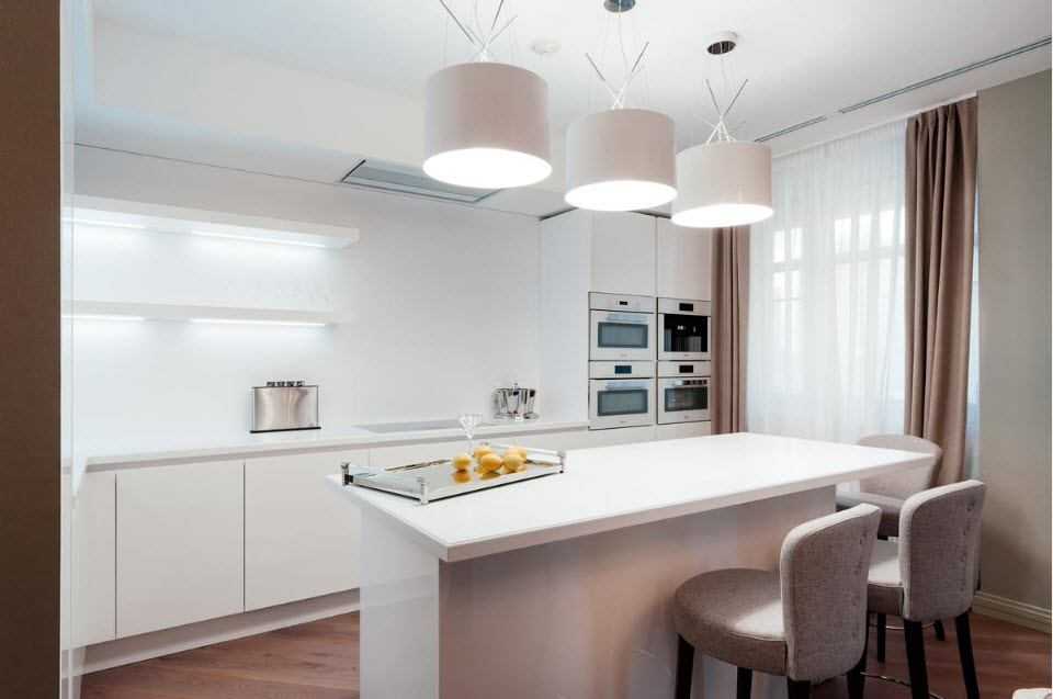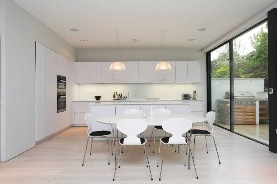 Такой интерьер больше всего подходит для больших помещений. Необходимо сделать четкую схему и подобрать каждый элемент. Чаще всего вся мебель и декор выполнены в белом или бежевом цвете. Кухонная мебель для встраиваемой техники подбирается очень тщательно. Предпочтение необходимо отдавать простым конструкциям с правильными геометрическими линиями.