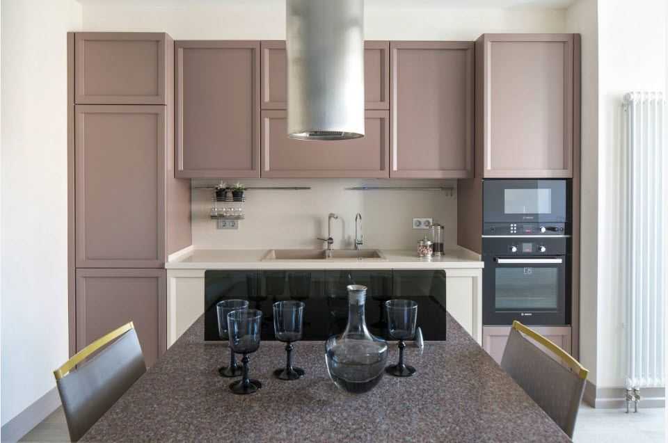 - Встраиваемый кухонный гарнитур может иметь разные варианты дизайна, что позволит сделать помещение уникальным.