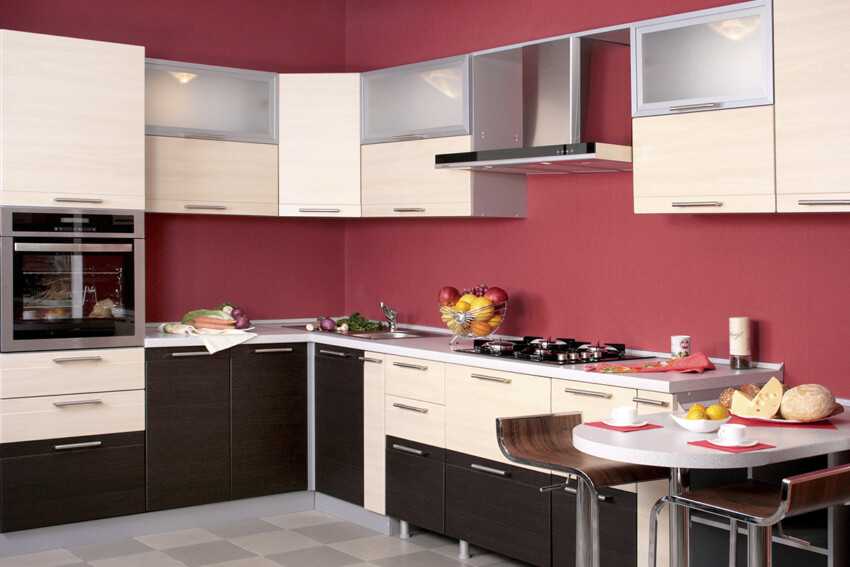 ДСП. Этот материал имеет недостатки. Форма фасадов кухни только прямая, дверцы много весят, а при попадании влаги в вырез для петель или при нарушении целостности покрытия возможно набухание и деформация поверхности. Варианты расцветок ограничены – под дерево и несколько стандартных тонов.