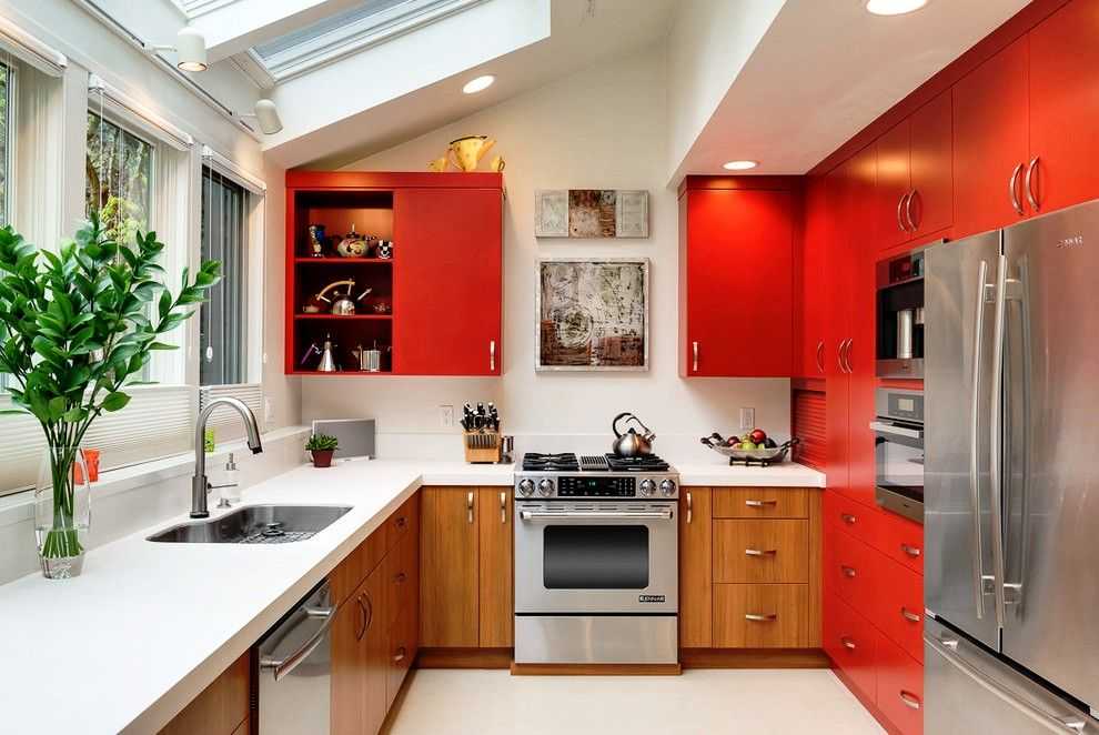 Чтобы сделать оформление кухонного пространства максимально ярким, можно остановиться на красных цветах интерьера. В такой палитре лучше выбрать теплые тона с желтым или коричневым отливом, либо холодные – с синими и фиолетовыми акцентами. Грубая ошибка – использовать чистый красный, т.к. он быстро надоест и будет выглядеть раздражающе.