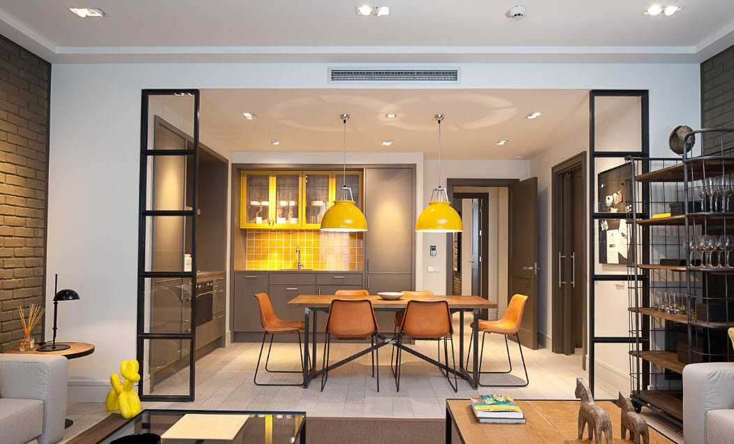 Встроенная кухня, необычное архитектурное решение и приятные полутона превратят это место в любимое пристанище для времяпровождения