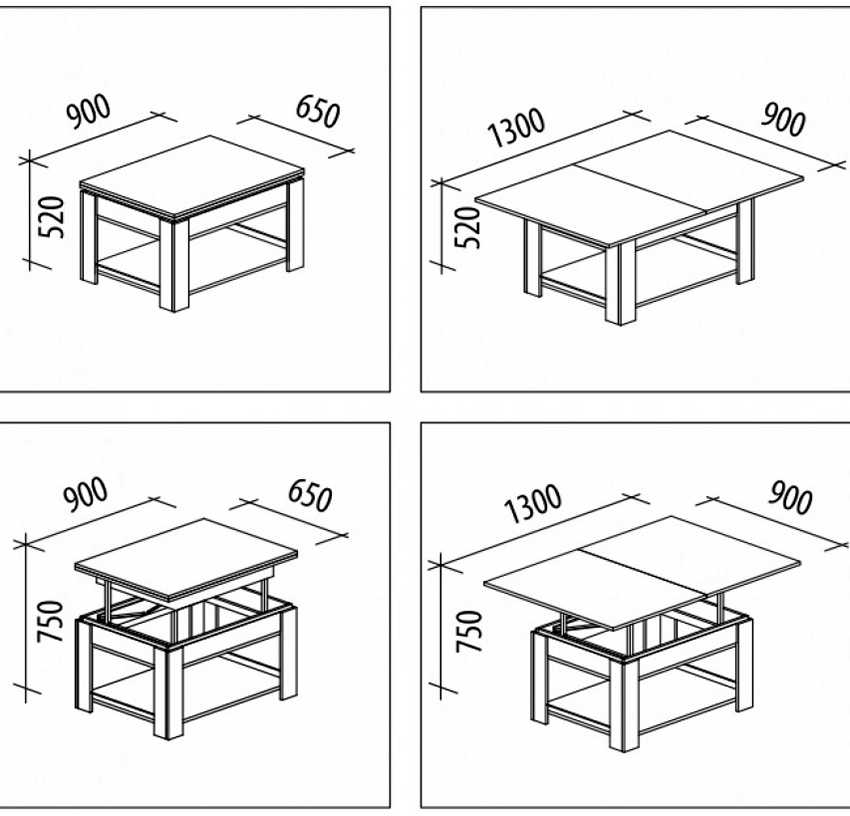- Прато Люкс — прямоугольный, из шпона, длина – 1050 (1900) мм, ширина – 730 мм, высота – от 340 до 750 мм;