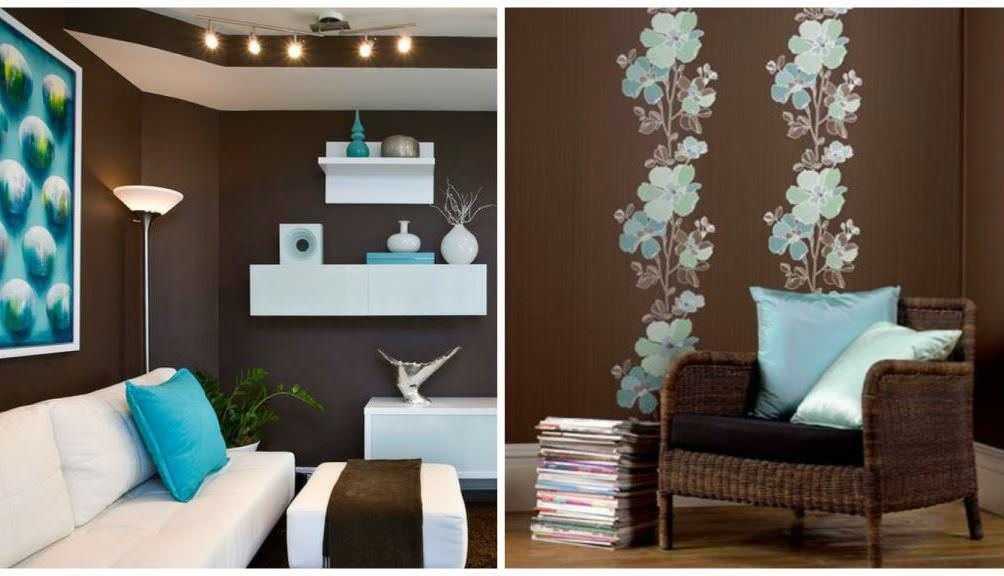 Данный тендем является также одним из удачных в дизайне комнат. Пространство будет выглядеть мягко, атмосфера станет теплой и непринужденной. Такое сочетание отлично подходит для спальни и гостиной. Для зала можно применить известную в дизайнерском искусстве технику «акцент». То есть коричневые обои наклеиваются на одну из стен. Для других настенных поверхностей применяются пастельные обои с узорами или орнаментом. Но такой интерьер нужно завершить добавлением ярких декорирующих предметов, например, синими подушками или осветительными приборами бирюзового цвета