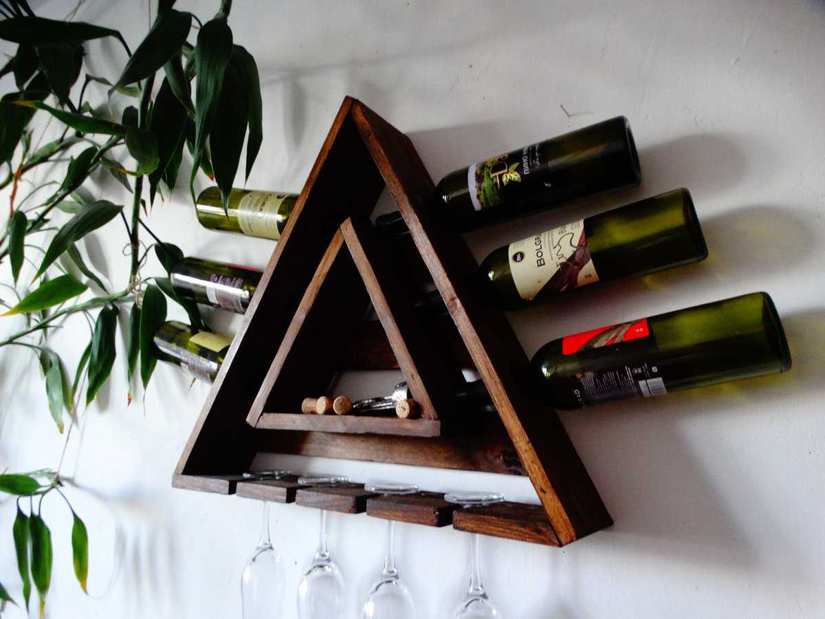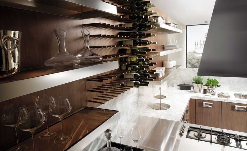 Кухонная зона часто служит местом для отдыха в кругу друзей. Спиртные напитки при этом можно хранить тут же. Только представьте себе уголок, напоминающий настоящий винный погреб, прямо у вас в кухне. Для этих целей лучше всего подходит открытый стеллаж из деревянного бруса.