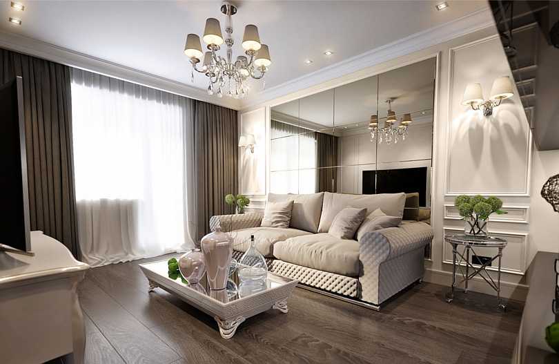- Прямоугольную форму комнаты легко подправить и придать ей квадратный вид можно, если повесить зеркала по длинным стенам.