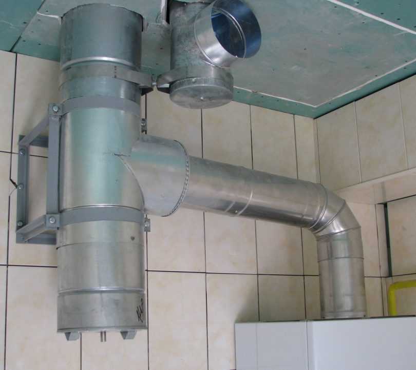 В верхней части потолка должно находиться вытяжное устройство. Обычно – это вытяжная труба. Диаметр трубы обозначают газовщики при создании проекта-схемы на строительство. По всем требованиям диаметр составляет 1,3 метра. Труба создает условия для нормального входа и выхода воздуха.