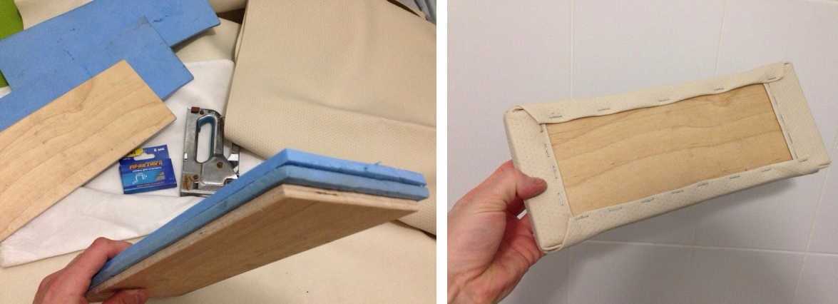 Почти все готово. Осталось сделать подушки под плечи. Для основания взяты куски фанеры, на них — тонкий мебельный поролон в два слоя, обтянутый экокожей с отверстиями. Для крепления кожзама использованы скобы и строительный степлер, но можно воспользоваться и мебельными гвоздями, если степлера нет.