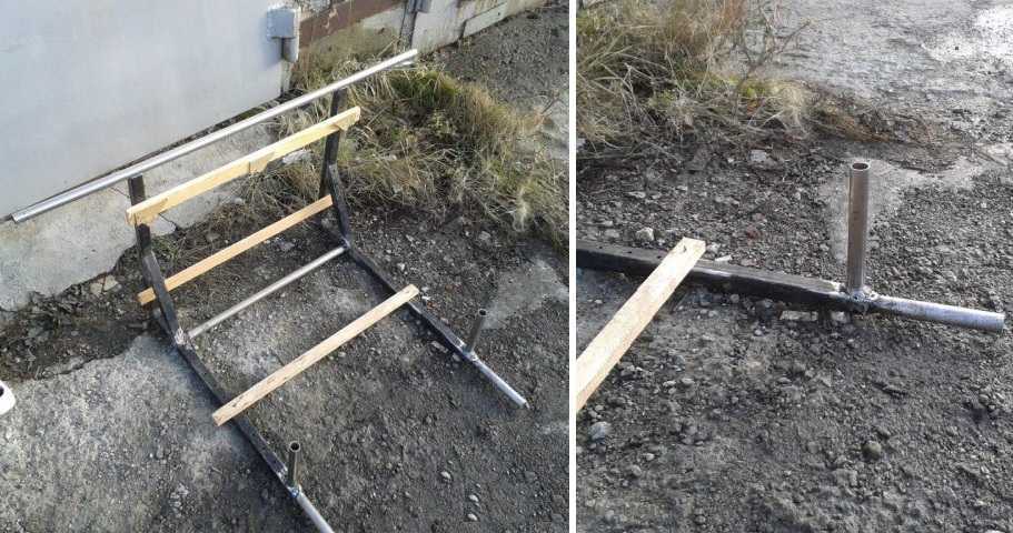 Если в наличии имеются трубы сравнительно большого диаметра и готовая П-образная перекладина, можно использовать представленную выше конструкцию (размеры произвольные). Под «колышками», естественно, понимаются металлические стержни достаточного диаметра или же часть П-образной перекладины. Желательно закрепить соединения сваркой.