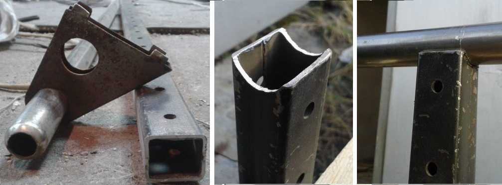 Для плотного примыкания круглой трубы и прямоугольной, в стойке болгаркой выпилен полукруг. Пришлось дорабатывать напильником, но прилегание очень хорошее. Осталось обварить.