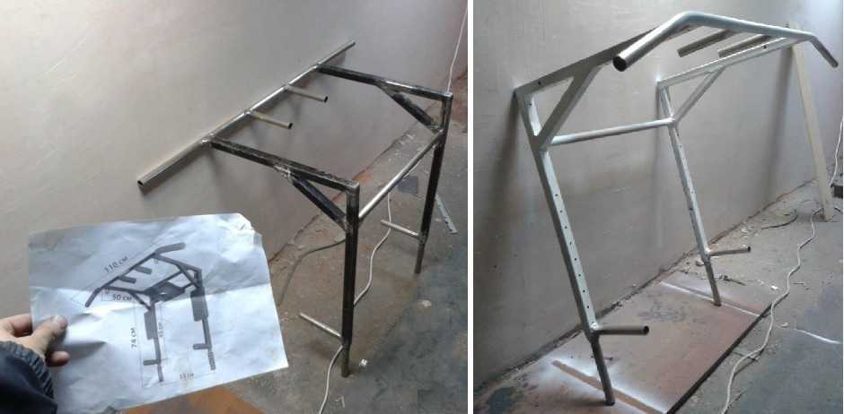 Несмотря на недостатки, вышеприведенная конструкция много раз повторена. Она проста, надежна, занимает немного места, поэтому популярна. Размеры немного корректируют, оставляя диаметры труб и толщину уголков без изменений или увеличивая толщину стенок. Пример — на фото ниже.