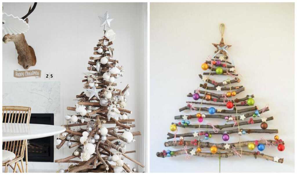 Оригинально смотрится праздничная елочка, сделанная своими руками из обычных палок. Это очень просто и интересно. Можно закрепить ее на стенку, необычно украсить разными игрушками из натуральных материалов – листочками, шишками, фруктовыми дольками, ягодами.