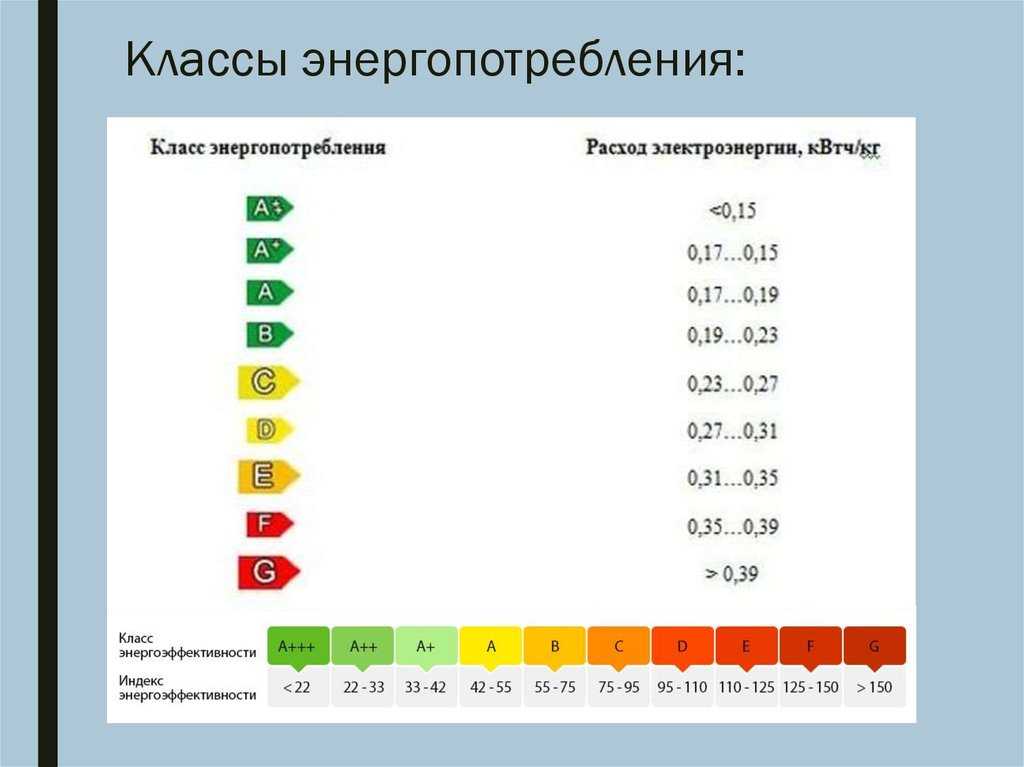 Говоря о классах энергопотребления, следует сказать, что представленная на сегодня в магазинах рассматриваемая техника подразделяется на модели групп A, B, C. Есть также категории D, E, F, G. Но данные модели уже и не выпускаются.