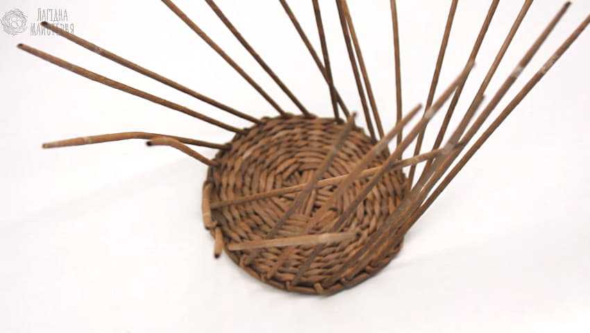 Далее продолжают плести еще два ряда, после чего витое плетение заканчивается и начинается обычное — оплетают главные прутья тонкой лозой внутри и снаружи. Но для этой техники понадобится вставить дополнительный прут, так как количество спиц должно быть нечетным.