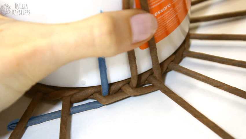 Следующим шагом берется одна из трубочек для плетения и фиксируется клеем ко дну. Все видели, как выглядит плетение на корзинах — веточка плетения то спереди стойки, то сзади.