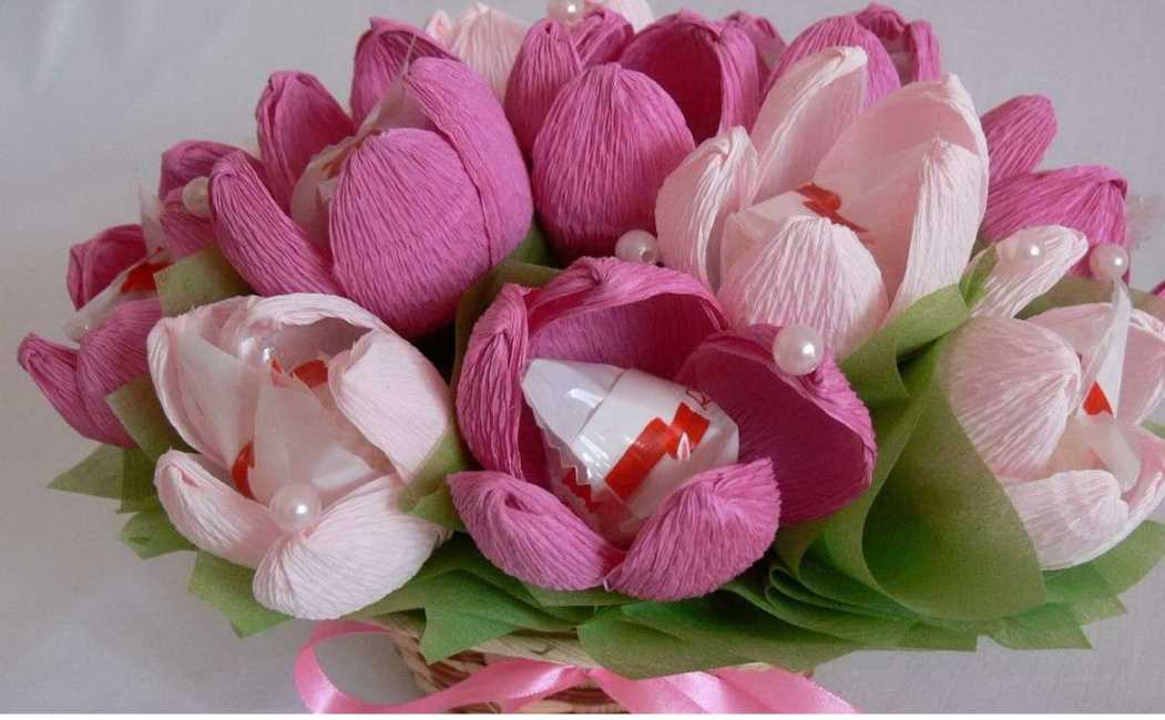 Букеты из живых тюльпанов, в основном, не долговечные. Чтобы довольствоваться красотой букета долго, можно создать его из конфет, которыми как только налюбуетесь, можно будет полакомиться.