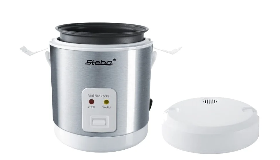 Открывает наш обзор рисоварка Steba RK 4 M – миниатюрный прибор для варки риса. Он получается в ней идеальным: рассыпчатым или клейким в зависимости от выбранного сорта, но вкусным и не пересушенным. В чаше объемом 0.9 л можно приготовить до 3 порций одновременно. Такой рис можно использовать в качестве гарнира или для приготовления роллов, салатов и других многокомпонентных блюд. Steba RK 4 M обладает продуманной конструкцией: корпус из нержавеющей стали, на котором находится панель управления, чаша с антипригарным покрытием, герметичная крышка и ручка для переноски. Прибор осуществляет варку и подогрев. Есть индикаторы, которые отображают активный процесс. Кабель питания съемный.
