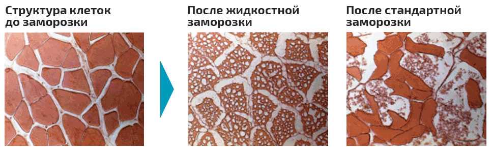 Прямое погружение продукта в жидкий хладагент является наиболее быстрым способом заморозки, поскольку теплоёмкость жидкости в несколько раз выше, чем воздуха. В результате фаза кристаллизации, в которой образуются микрокристаллы льда, проходит всего за несколько минут, что позволяет максимально сохранить структуру продукта и его вкусовые свойства.