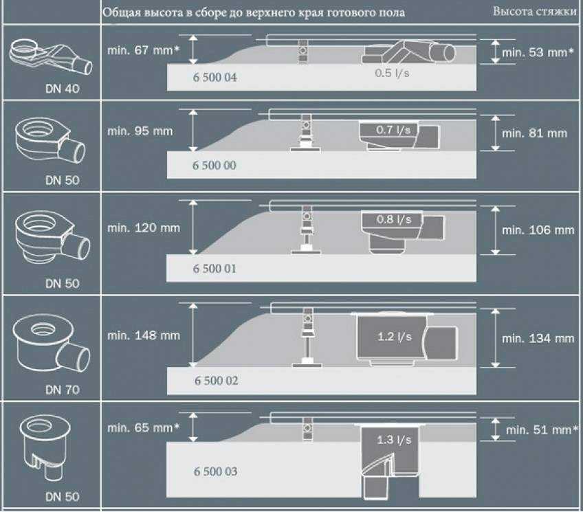 Форма и размеры трапов представлены целой линейкой от различных производителей. От самых простых надежных моделей до сложных конструкций с отсечкой и каскадом обратных сухих и мокрых клапанов. Для удобства разработаны некоторые стандарты по высоте изделия, которая подбирается в зависимости от толщины стяжки пола.