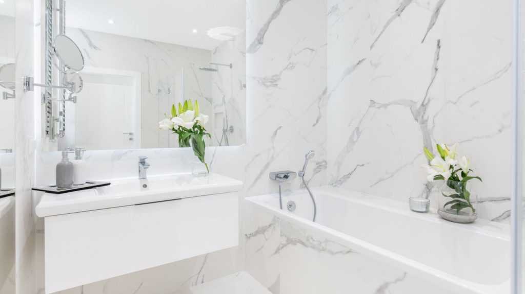 Имитация мраморного керамогранита, используемого для отделки стен ванной комнаты, практически не требует ухода — они не нуждаются в пропитке, не царапаются, не пачкаются, просто протираются тканью. Еще один хит материала — большие керамические пластины размером 100 х 300 см (керамогранит, спеченный кварц).