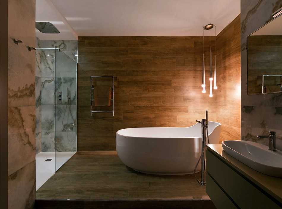 Отделка ванной комнаты делается и по типу хай-тека: хромированная фурнитура, белые и бежевые оттенки. Активно применяется сочетание разных направлений в адекватной форме, к классическому исполнению добавляются интересные акценты — органично смотрятся деревянные детали.