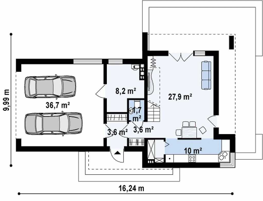 Небольшой наклон крыши обеспечивает сток дождевой и талой воды и не мешает безопасно передвигаться по крыше. Расчетная площадь 86 м² увеличивается за счет эксплуатируемой крыши. Монолитное перекрытие и ПВХ мембрана крыши гарантируют длительный срок эксплуатации дома. Плоская крыша подчеркивает объемы помещения, придает всему строению современный вид.
