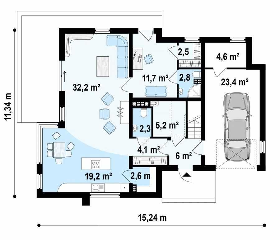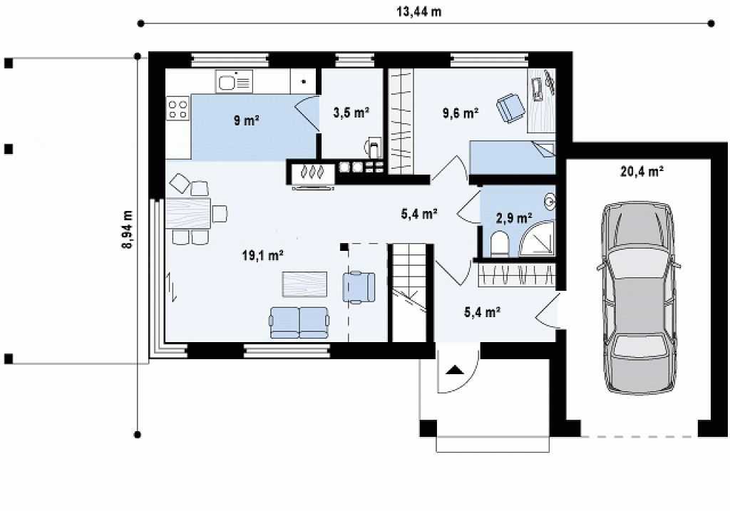 Небольшая семья со средним достатком удобно разместится в современном одноэтажном компактном домике, крыша которого служит дополнением к общей площади. Панорамные окна, большая кухня, ориентирование жилых помещений на юг, юго-запад поддерживают тепло и уют дома.
