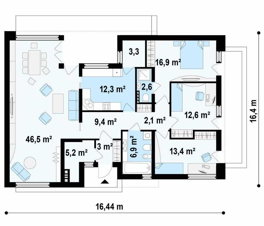 Одноэтажный дом с плоской крышей до 100 кв. — хороший выбор для всех людей, которые хотят иметь небольшой объект, в котором с комфортом могут разместиться 2-3 человека. Это будет хорошее предложение для пожилых людей из-за отсутствия внутренней лестницы.