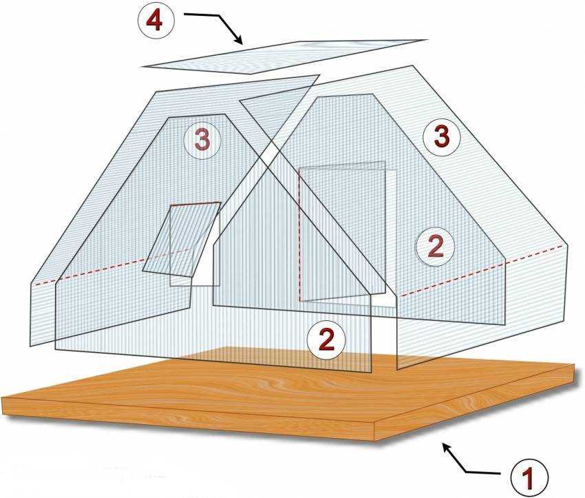 Схема мини парника из листового поликарбоната (1 — основание парника; 2 — задняя и передняя стенки; 3 — скаты крыши; 4 — верх крыши)