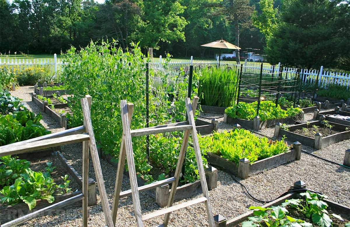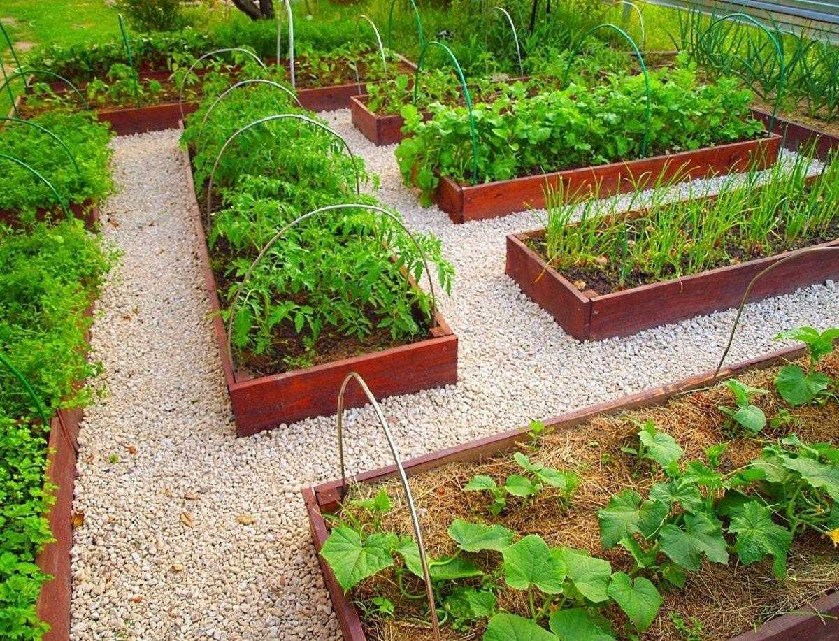Пространство между грядками можно использовать в качестве дорожек. Если проложить геотекстиль и присыпать его щебнем, то получатся замечательные садовые дорожки, ходить по которым будет удобно в любую погоду. Также можно засеять пространство между грядками газонной травой.