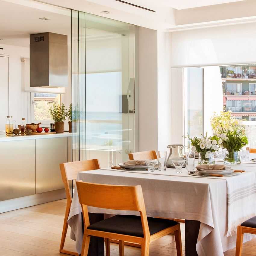 На фото – вариант стеклянной перегородки между кухней и гостиной.