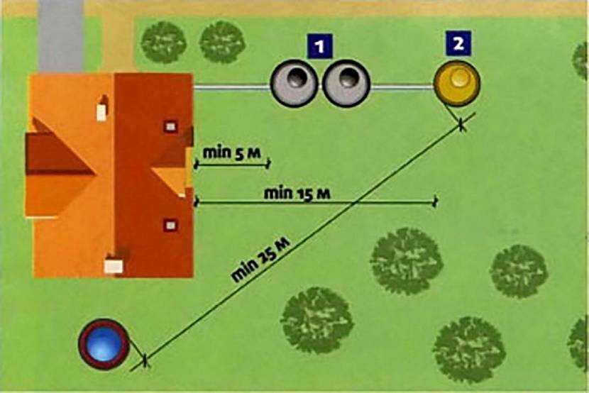 - Расстояние от фундамента основного дома и хозяйственных построек до колодца не должно быть меньше 5 м