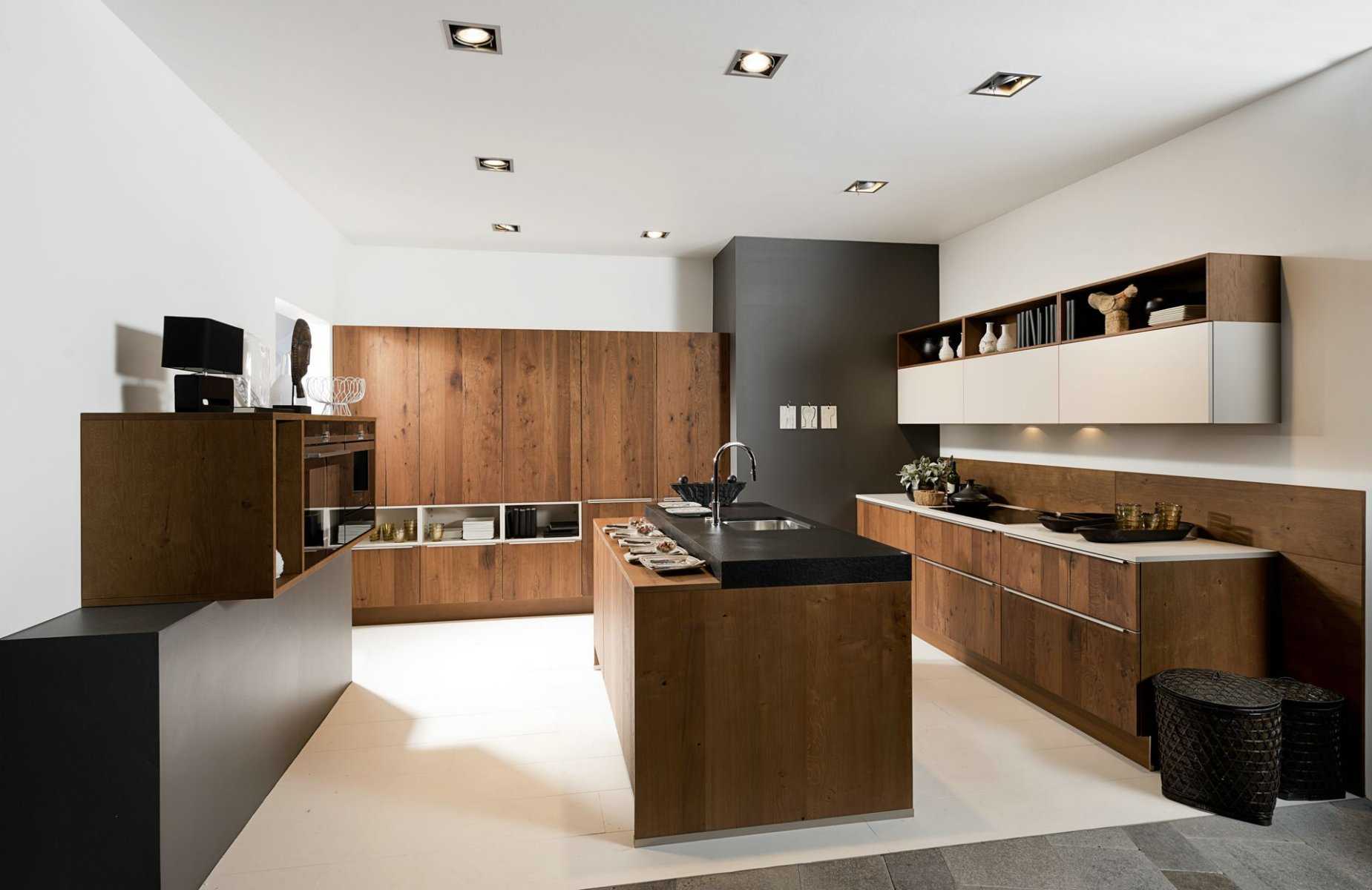 Современный стиль. Абсолютное большинство кухонь из Германии выполнено в современном стиле. Но это не только холодный минимализм. Так, фасады вполне могут быть облицованы натуральным шпоном, а шкафчики изнутри могут иметь то же ламинированное покрытие под дерево, что и снаружи.