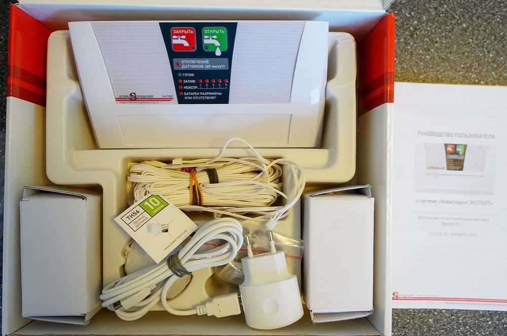 Прибор имеет три датчика, мгновенно и автоматически блокирует подачу холодной и горячей воды. Защитит имущество и жилище. Световые и звуковые датчики, которые расположенные на центральном блоке мгновенно отреагируют на протечку воды и предупредят владельца.